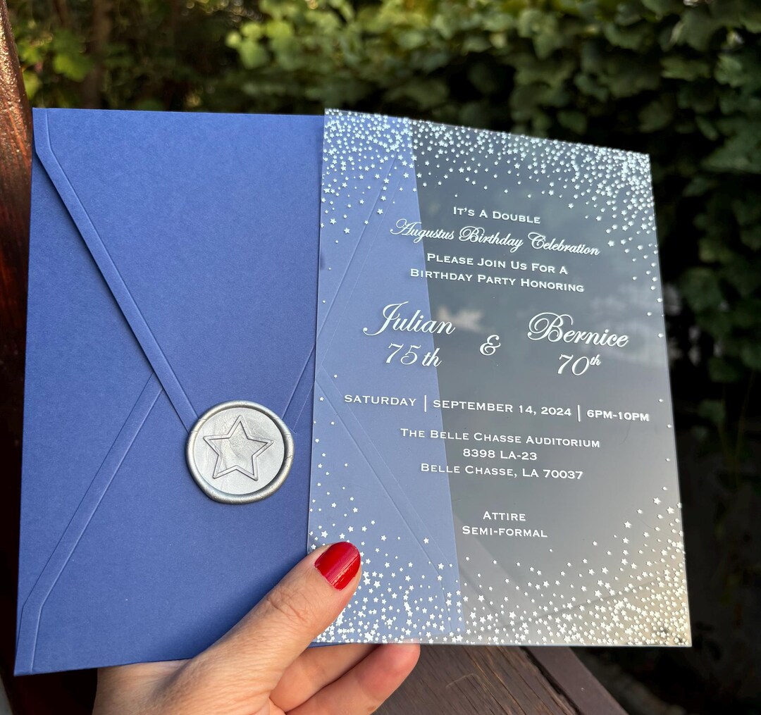Blue Birthday Invitation. Acrylic Invite: Royal Blue Envelope, Silver ...