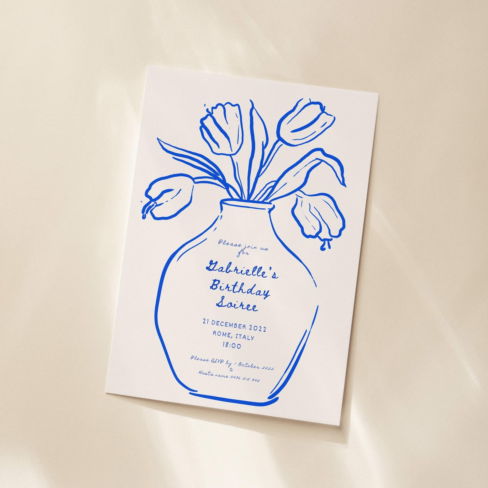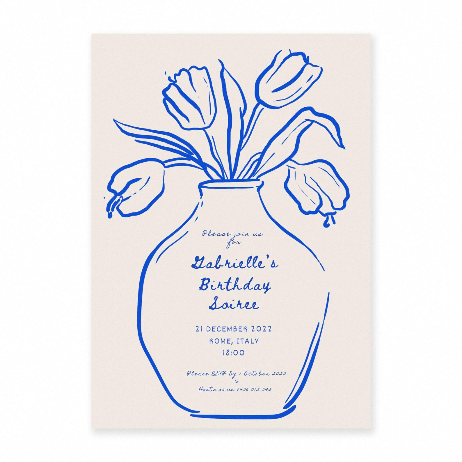 Hand Drawn Blue Flower Vase Illustrated Soiree Invite Template ...