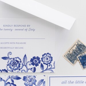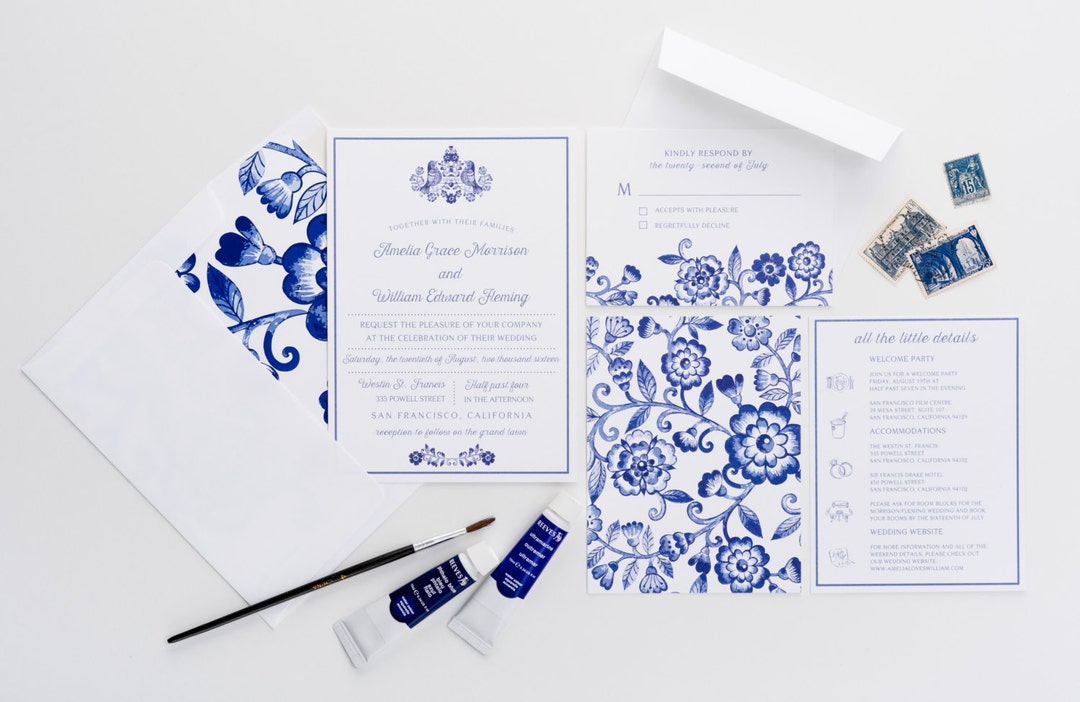 Floral wedding invitations featuring a blue delft pattern | Wedding ...