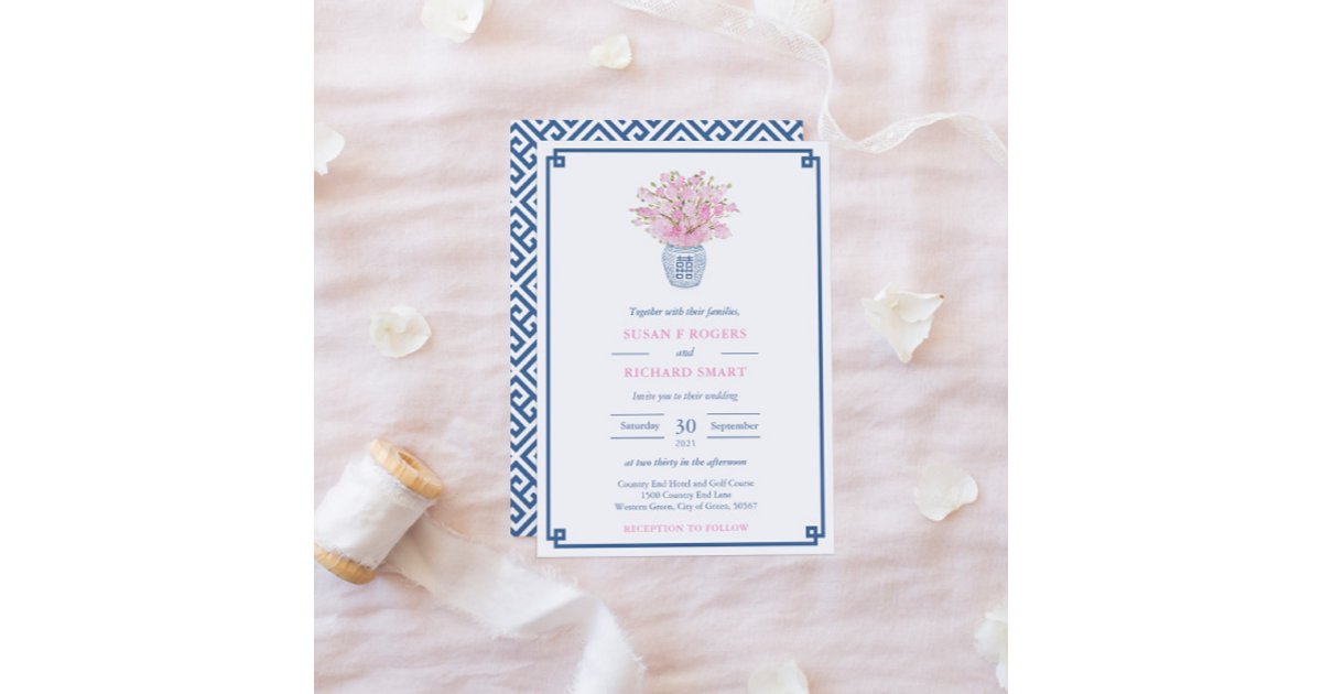 Chic Pink And Navy Blue Chinoiserie Vase Wedding Invitation | Zazzle
