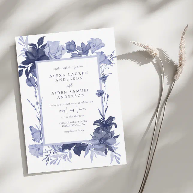 Blue Floral Frame Watercolor Wedding Invitation | Zazzle