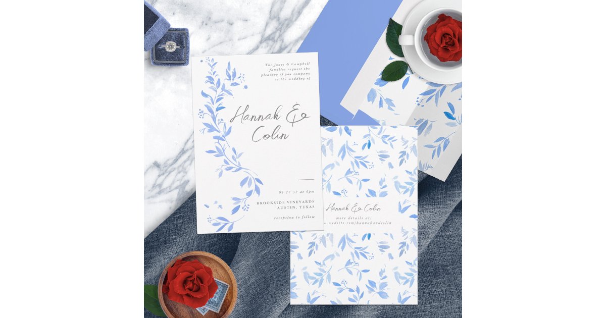 Blue Floral Wedding Invitation Printed Blue White Porcelain Invite ...
