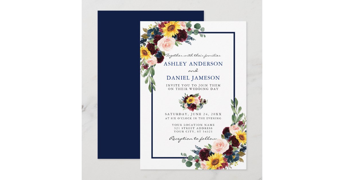Watercolor Mixed Floral Wedding Blue Frame Invitation | Zazzle