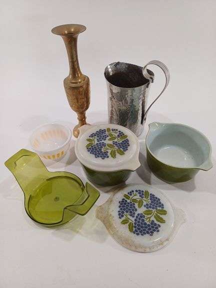 (4) PC Set of Blueberry Pyrex Ovenware, (1) Metal Floral Pitcher, Gold ...