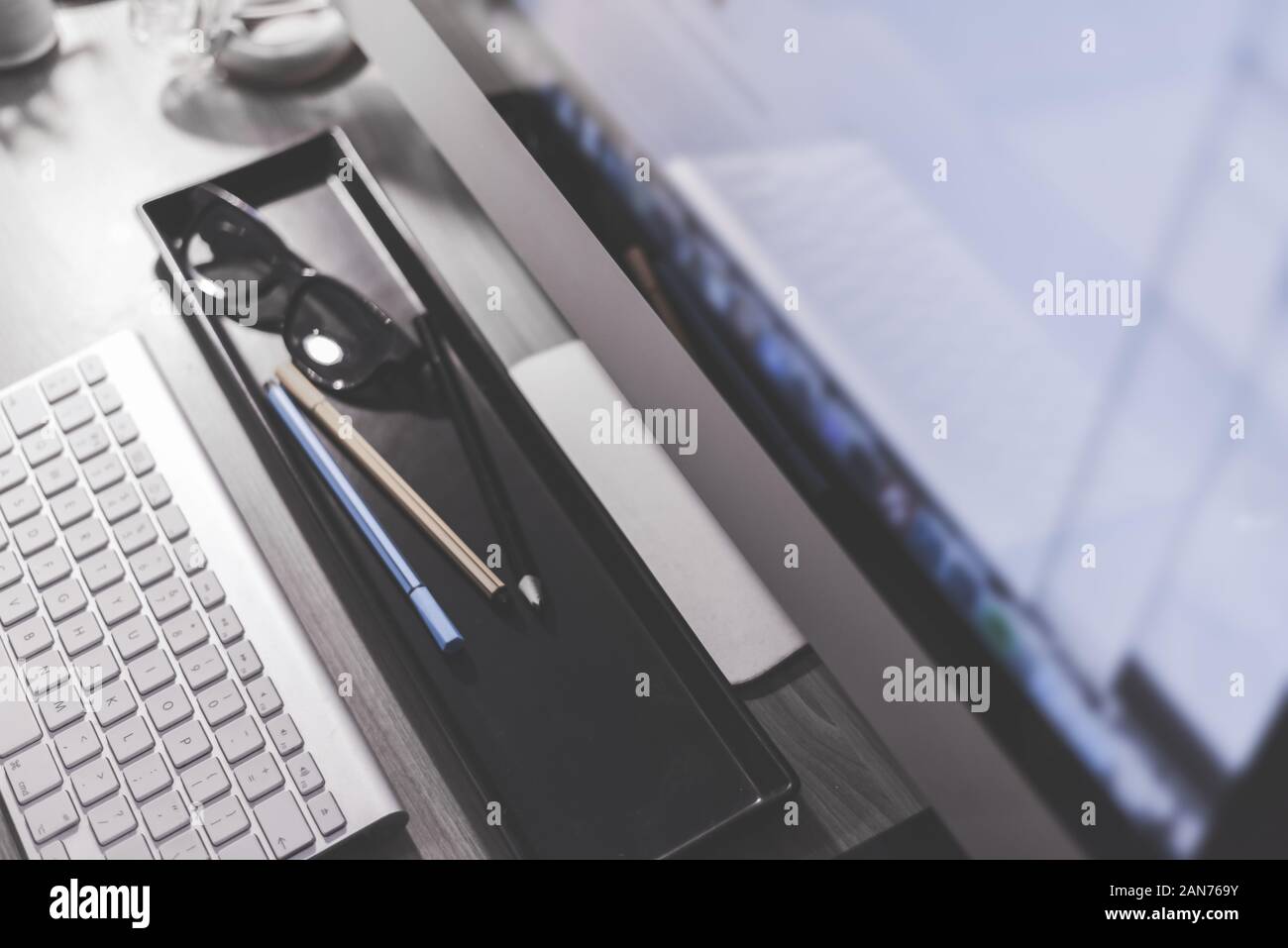 A blurred Computer on an office idea room Stock Photo - Alamy