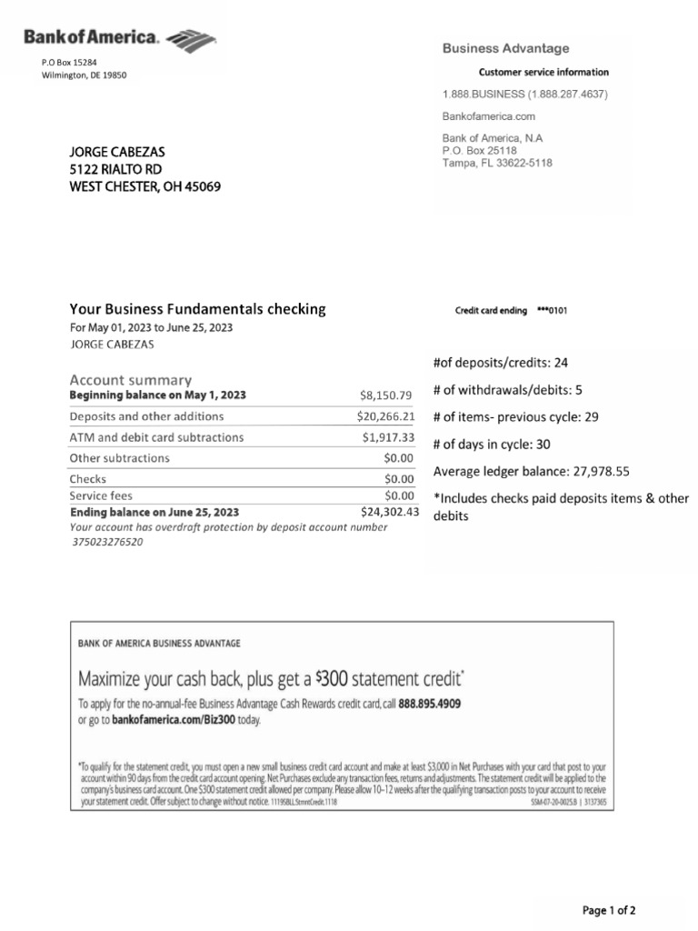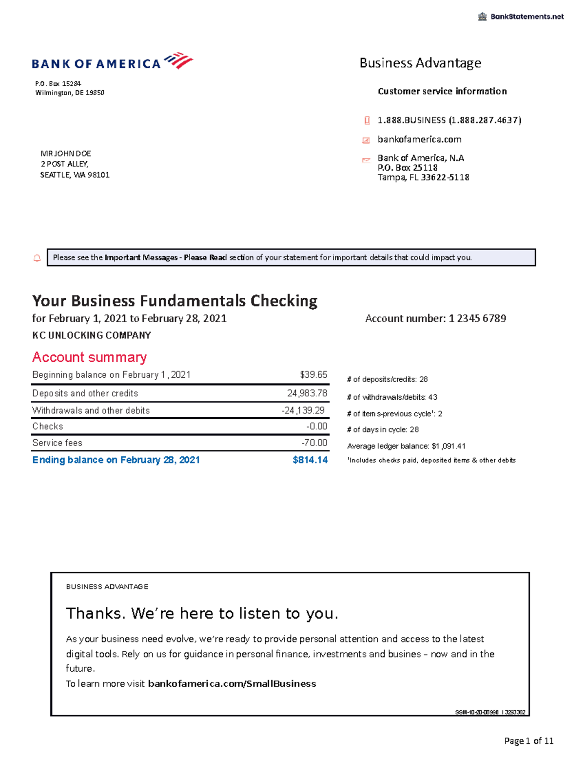 Bank of America Statement Bank Statements - Business Advantage P. Box ...