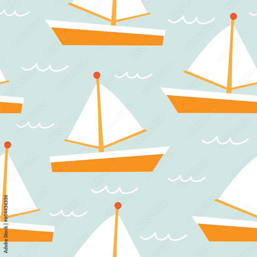 Sailboat and wave. Seamless pattern with cartoon boats. Vector texture ...