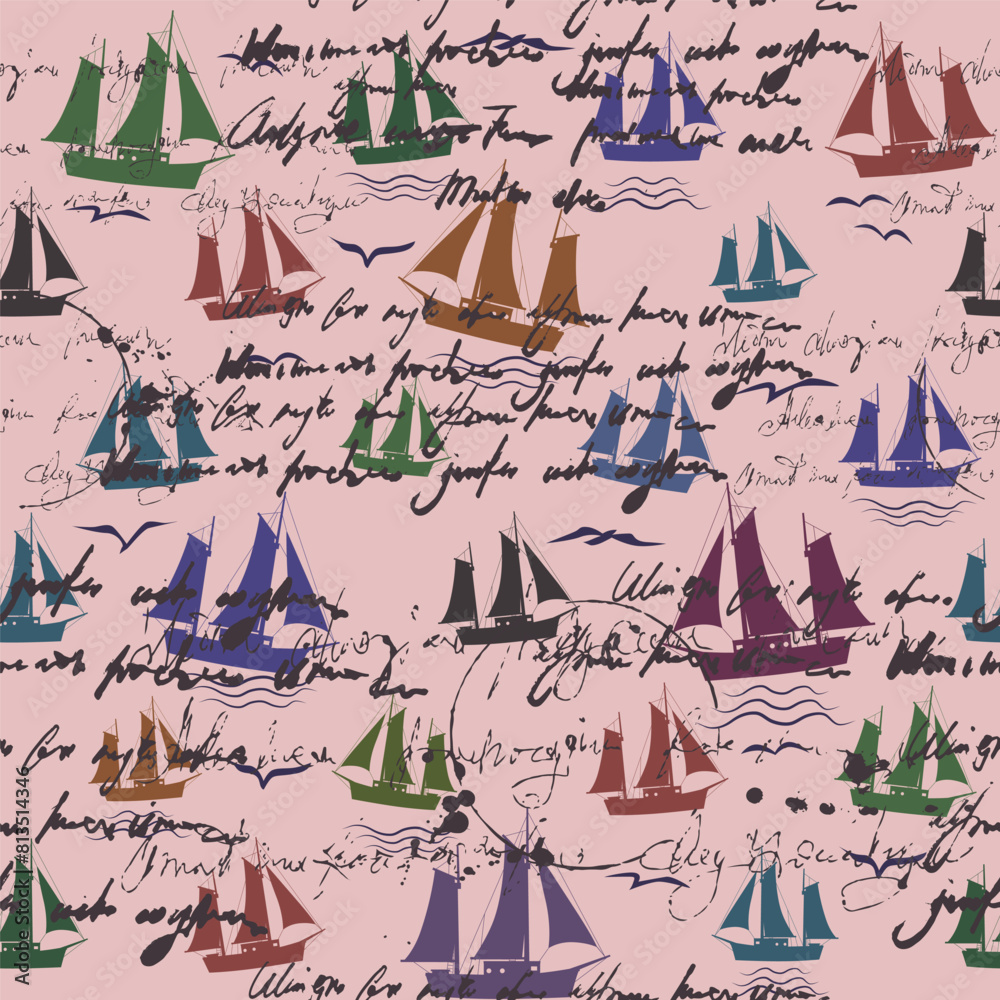 Sailboat seamless pattern, unreadable text, handwritten notes, palm ...