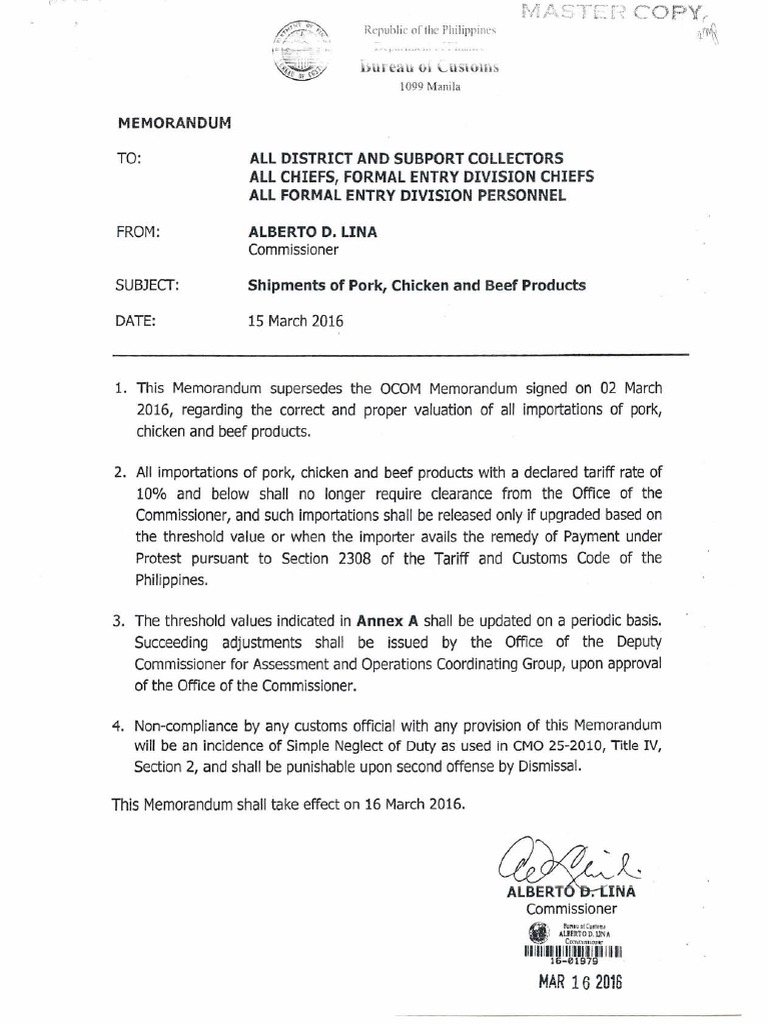 BOC Memo 2016-03-019 Shipments of Pork Chicken and Beef Products | PDF ...