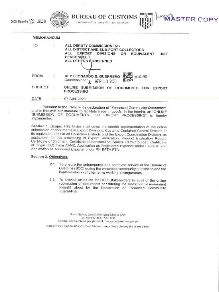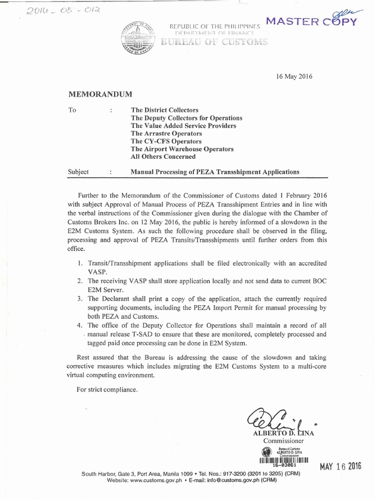 BOC Memo 2016-05-012 Manual Processing of PEZA Transshipment ...
