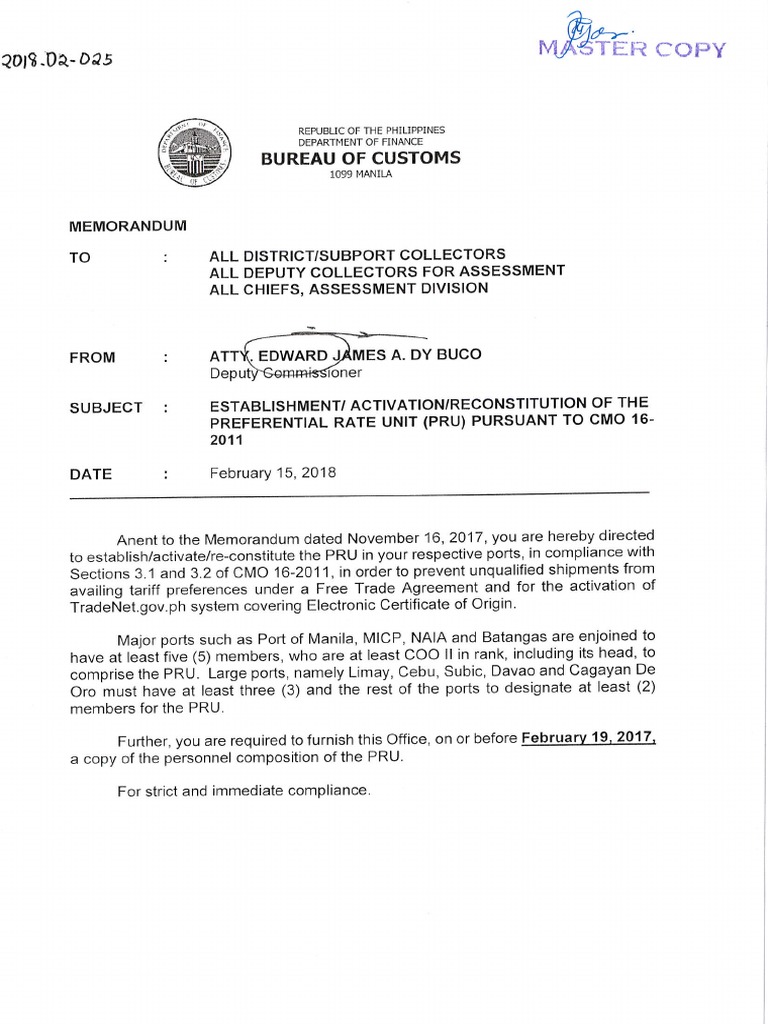 BOC Memo-2018-02-025 -- Establishment of the Preferential Rate Unit ...