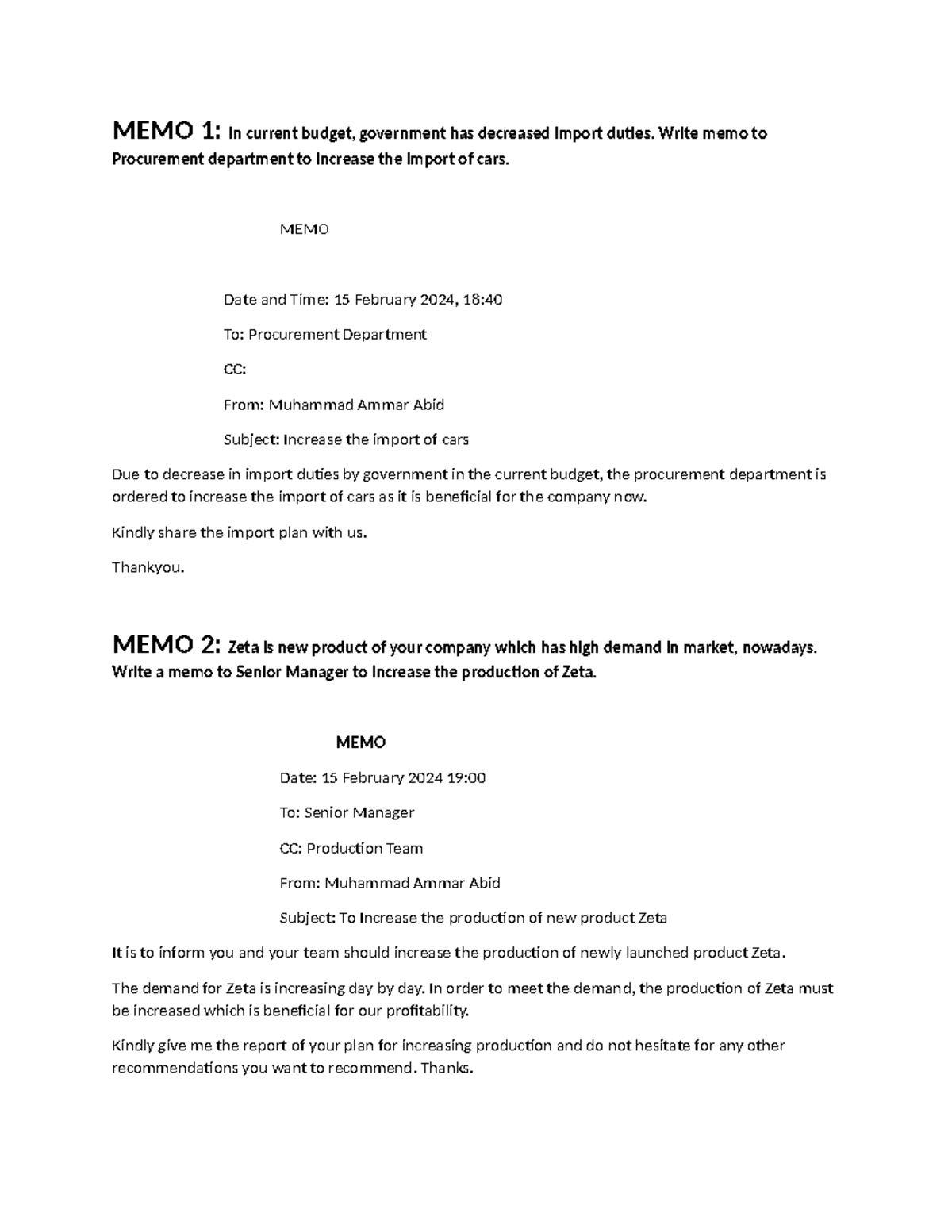 Memo writing in PRC-1 BWCS - MEMO 1: In current budget, government has ...