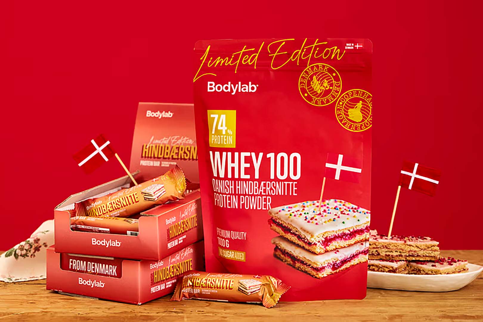 Bodylab's authentic Danish Raspberry Slice protein powder and bar