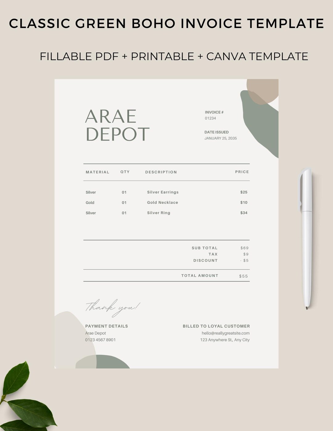 Green Boho Invoice Template: Printable, Fillable, Canva (PDF) - Etsy