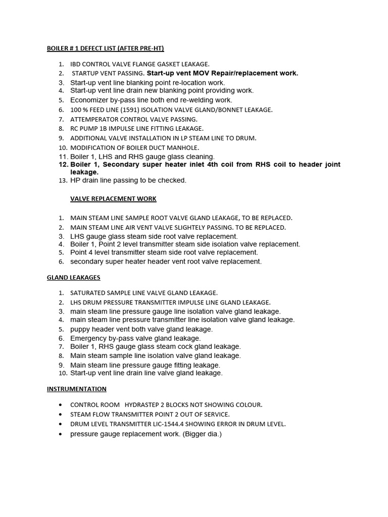 Boiler 1 Defect List | PDF