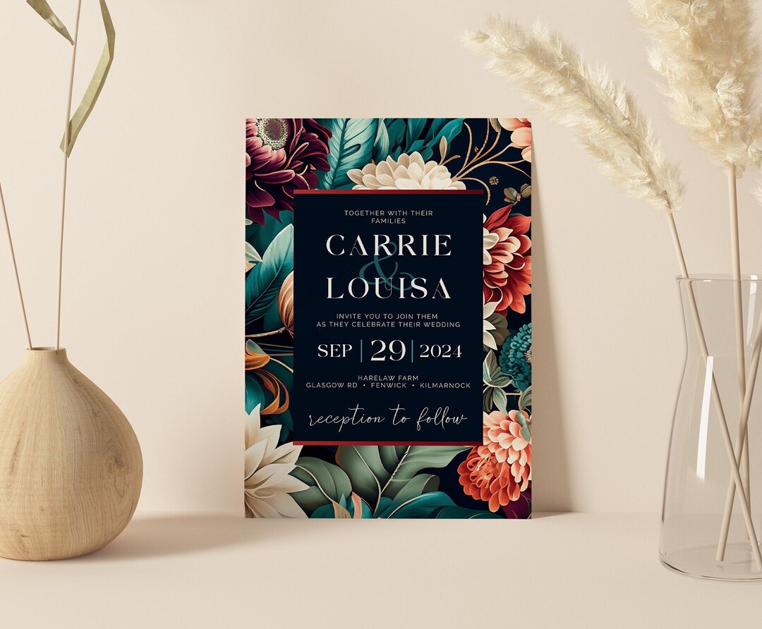 Bold Funky Colorful Floral Dark Chic Wedding Invitation | Zazzle