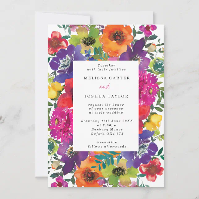 Fun Bright Bold Color Watercolor Floral Wedding Invitation | Zazzle