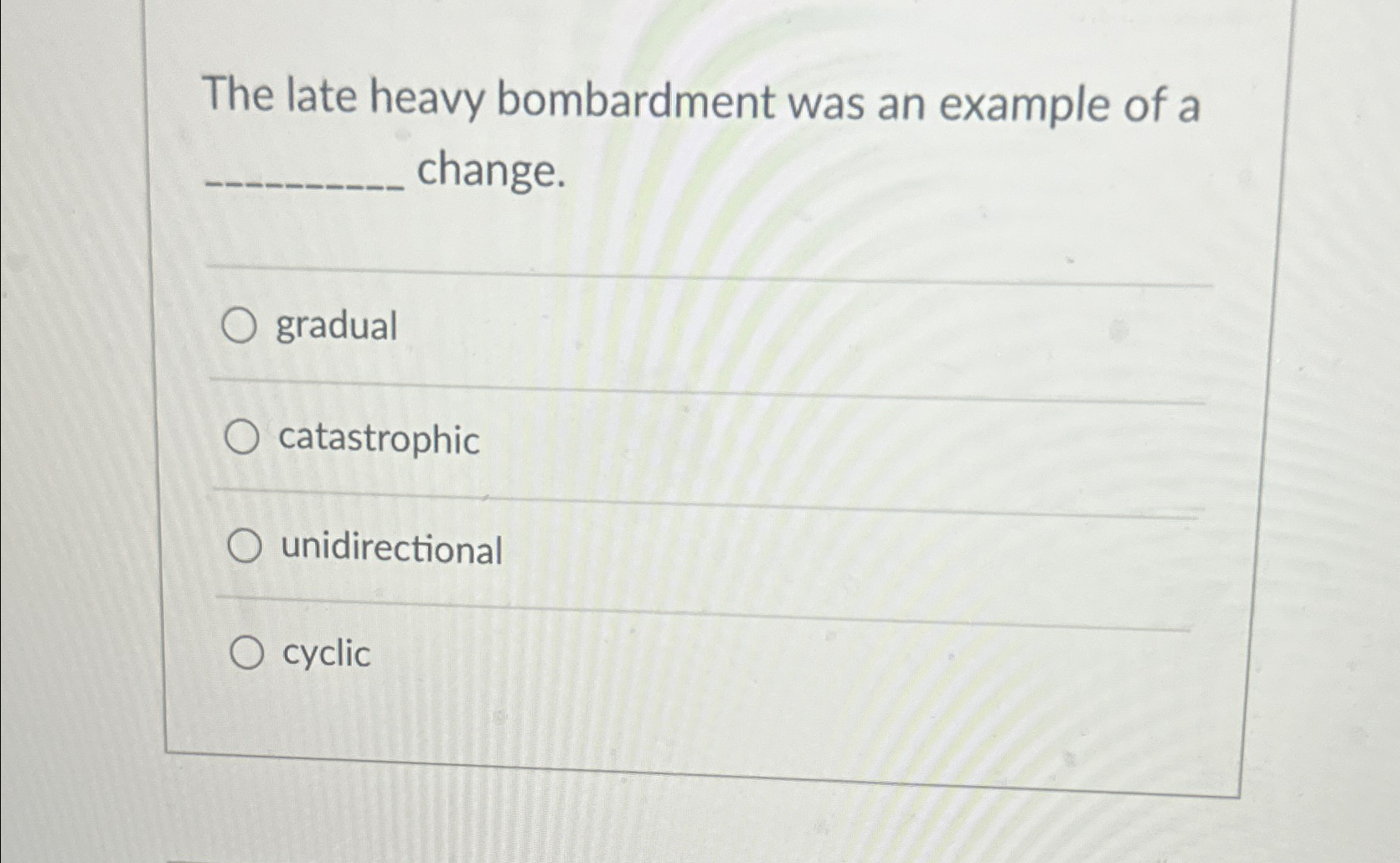 Solved The late heavy bombardment was an example of a | Chegg.com