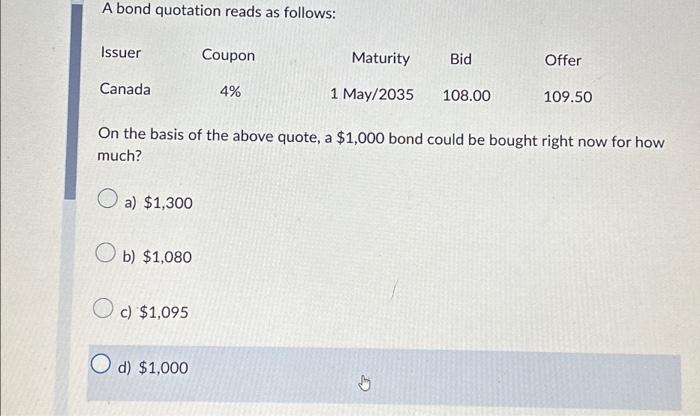 Solved A bond quotation reads as follows: Issuer Canada a) | Chegg.com
