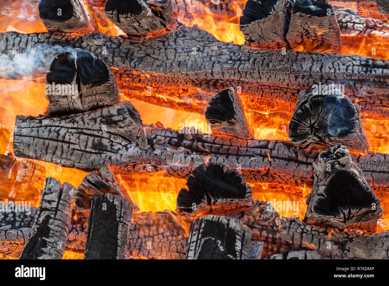 Wood logs arranged as a stack set on fire Stock Photo - Alamy