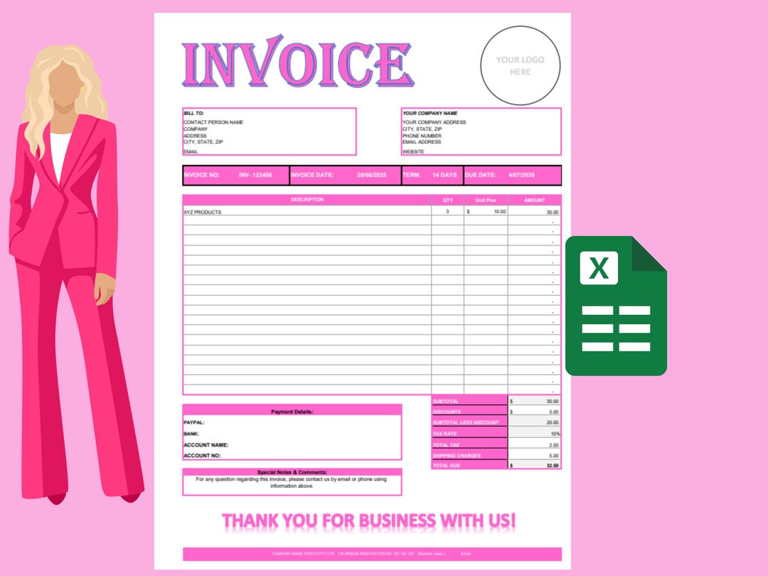 Pink Invoice Template for Excel: Small Business Billing + Bonus Tracker ...