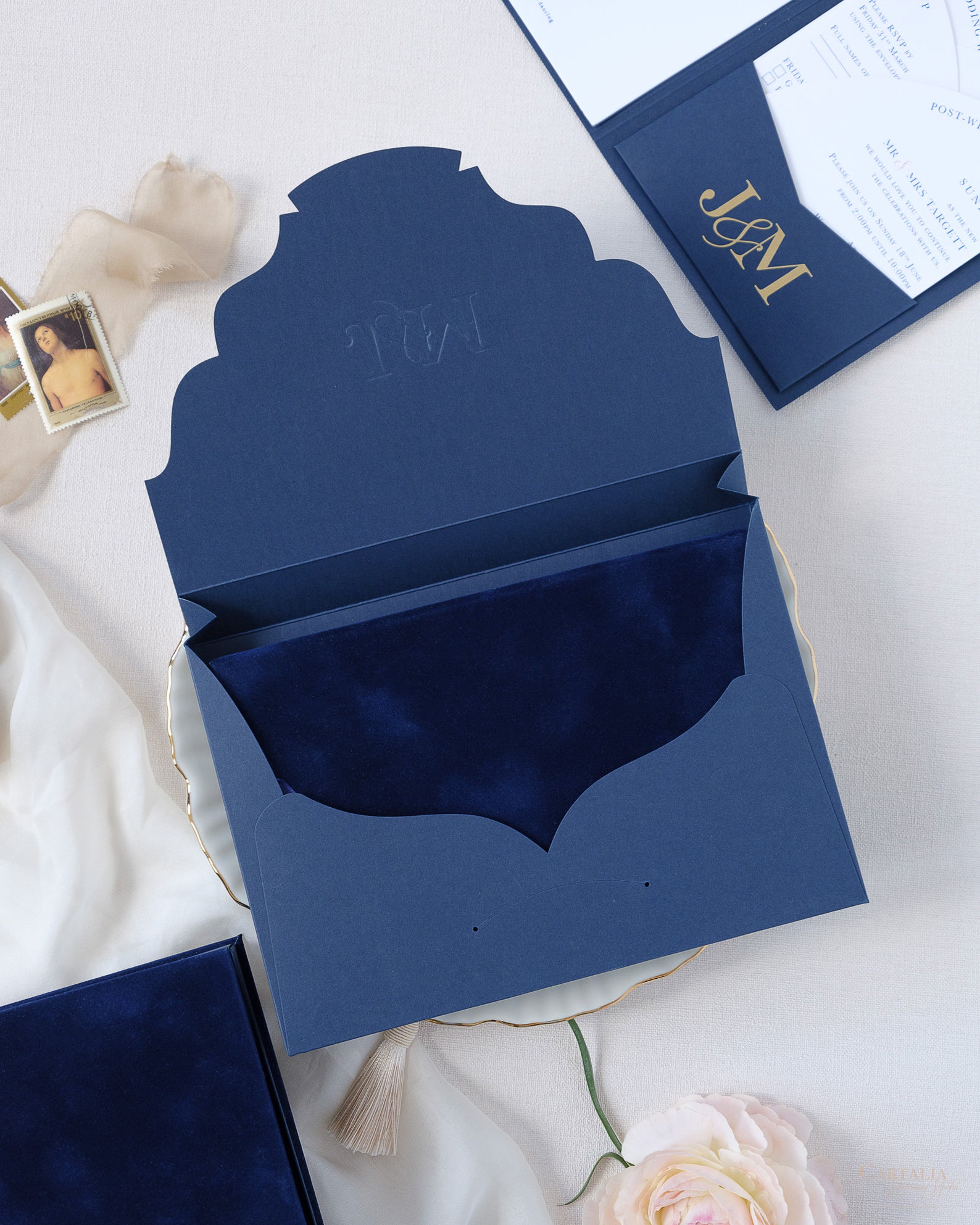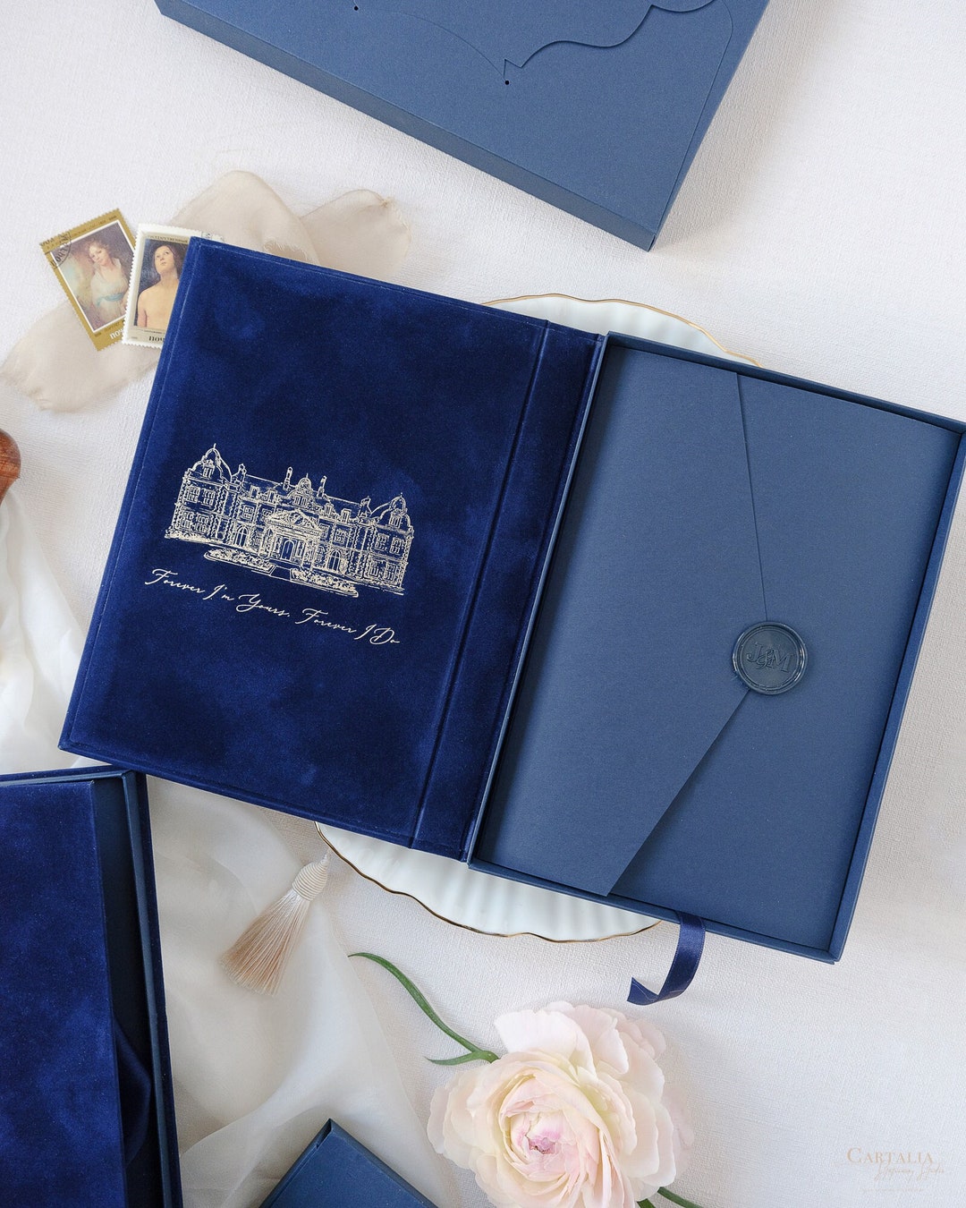 Luxury Velvet Hard Back Book & Box Pocket Invitation in Navy with Gold ...