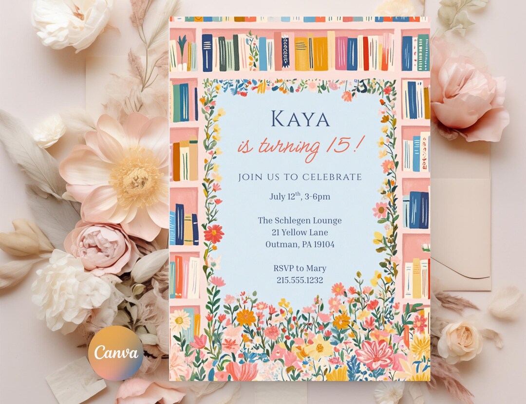 Pastel Floral Bookshelf Frame Book Birthday Invitation Template Link ...