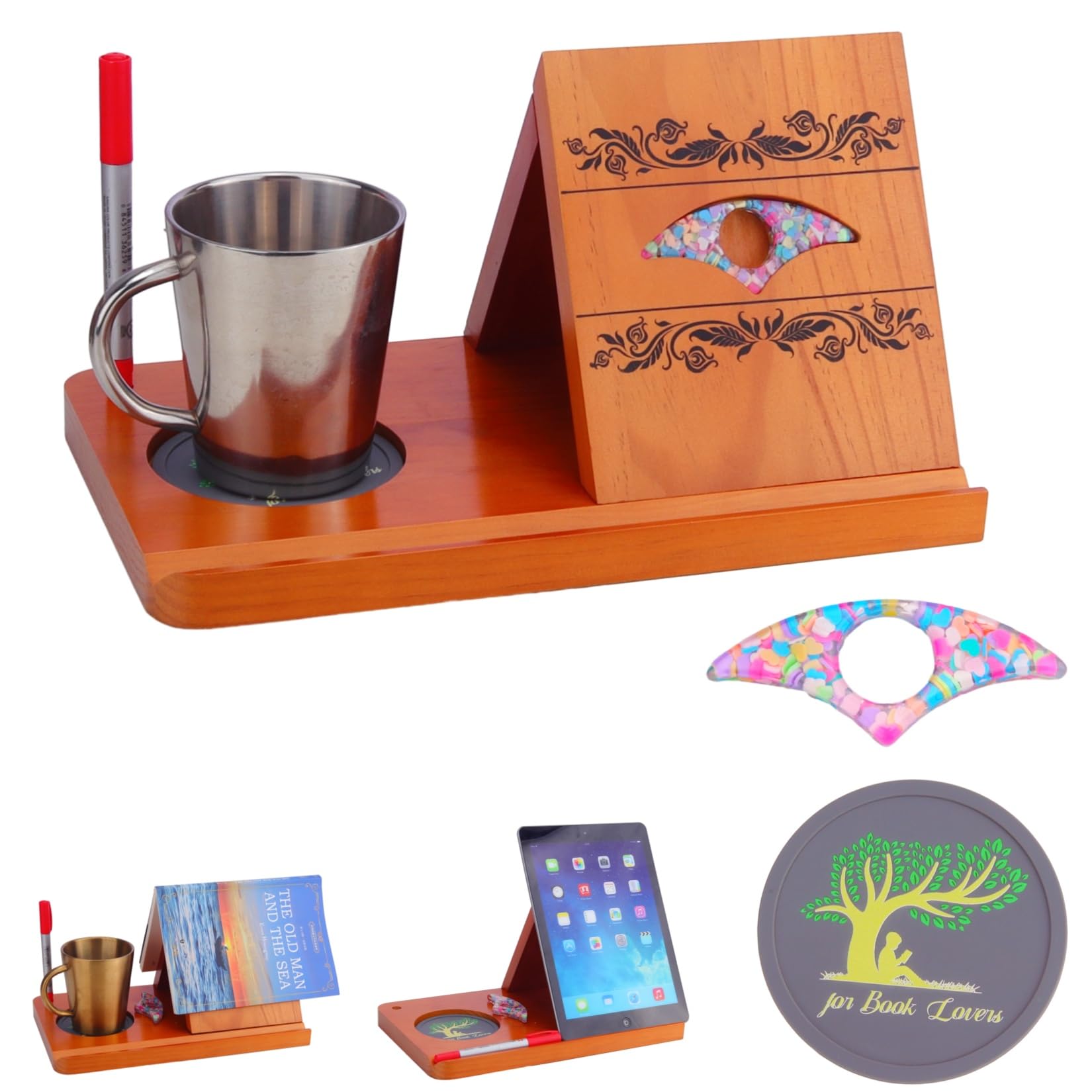 Wooden Book Rest with Cup & Mobile/iPad Holder | Triangle Book Stand ...