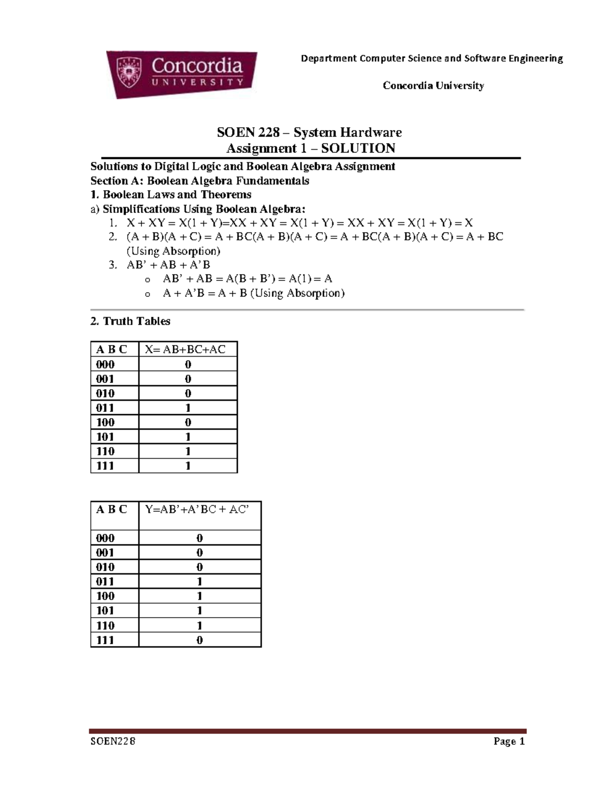 SOEN 228 Assignment 1: Digital Logic & Boolean Algebra Solutions - Studocu