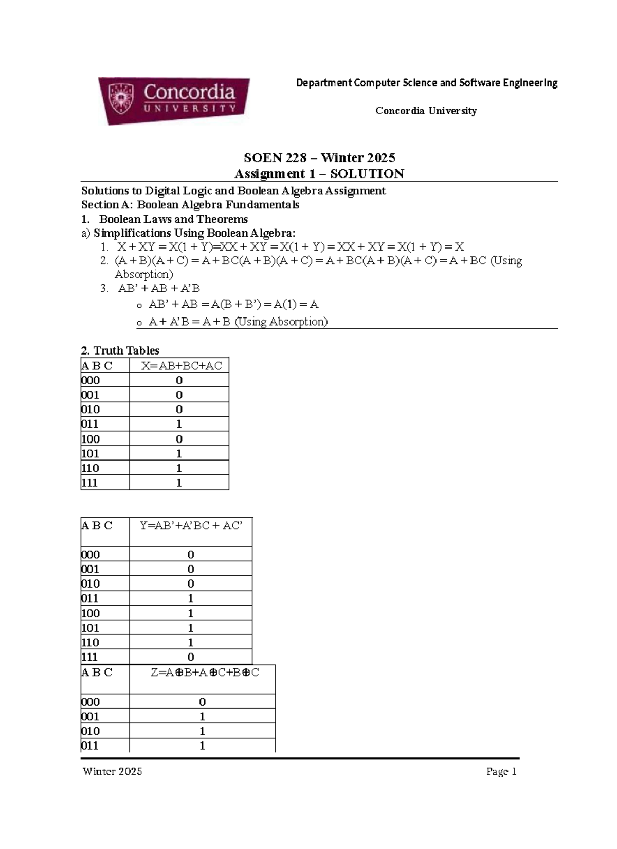 SOEN 228 Winter 2025 Assignment 1 Solutions: Digital Logic & Boolean ...