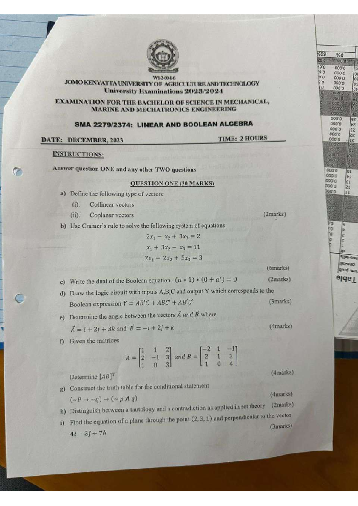 SMA 8 Linear and Boolean Algebra Exam Questions - Dec 2023 - Studocu