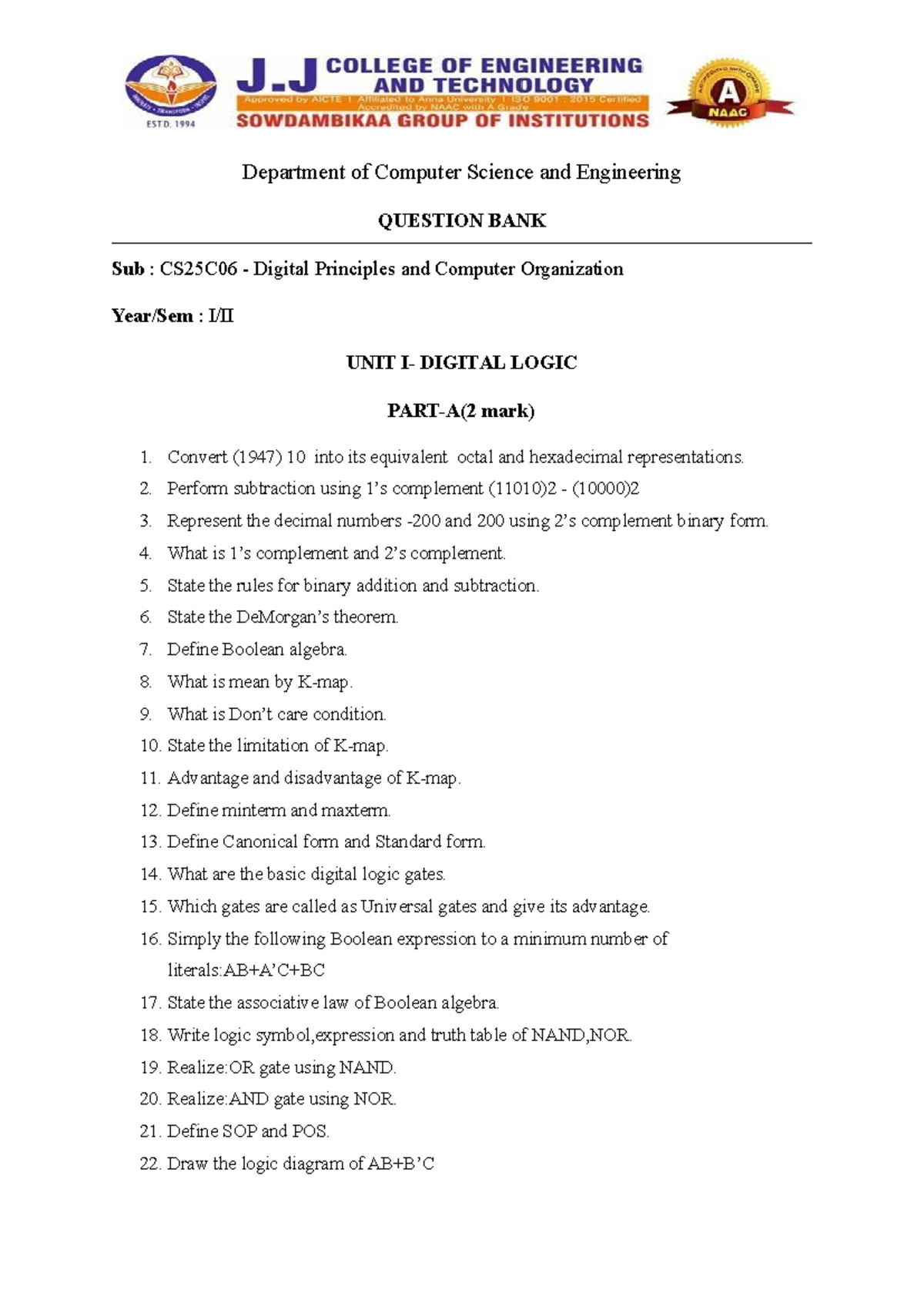 DPCO CS25C06 Question Bank: Digital Logic & Boolean Algebra - Studocu