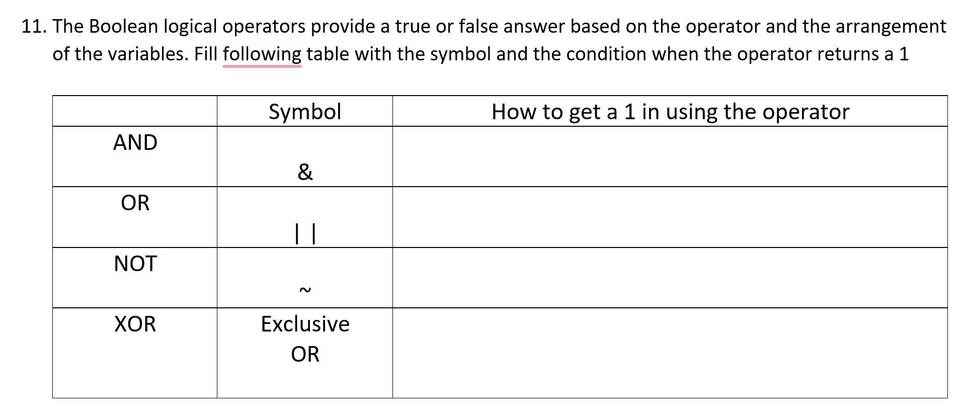 Solved 11. The Boolean logical operators provide a true or | Chegg.com