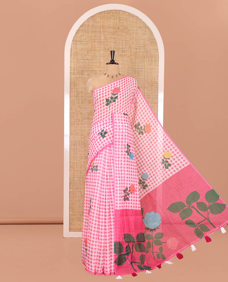 Borderless Pink Linen Cotton Saree, Adorned with Rose Floral Buttas an
