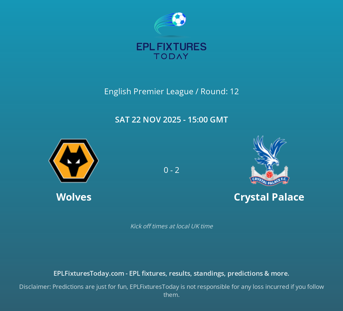 Sat 22 Nov 2025: Wolves vs Crystal Palace - EPLFixturesToday.com