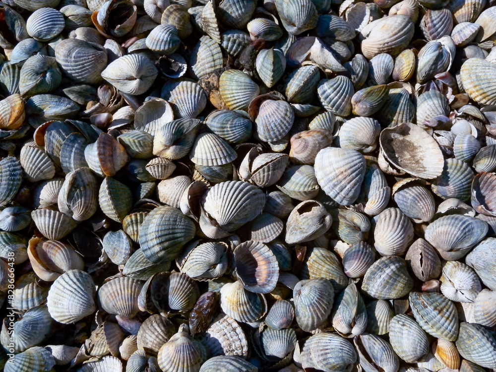 Dry bottom of a reservoir covered with a layer of shells of bivalve ...