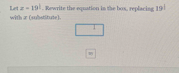 Let x=19^(frac 1)5. Rewrite the equation in the box, replacing 19^(frac ...