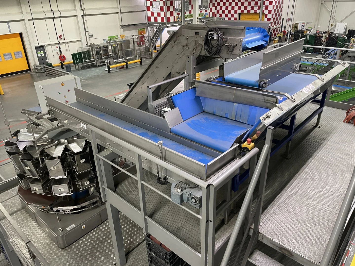 Platform for weigher with feeding conveyors and hopper • Duijndam Machines