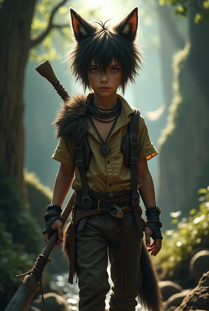 Anime wolf boy with green blueish eyes and brown fluffy ears and tail ...