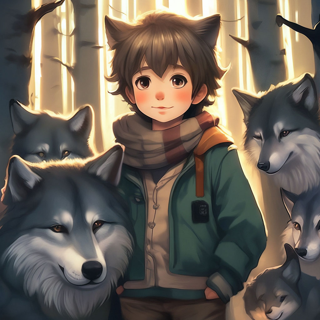 "A boy in the forest with wolves is cute" — image created in Shedevrum