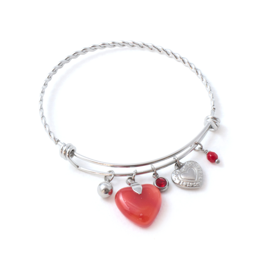 Bracelet jonc acier avec un coeur rouge et des breloques