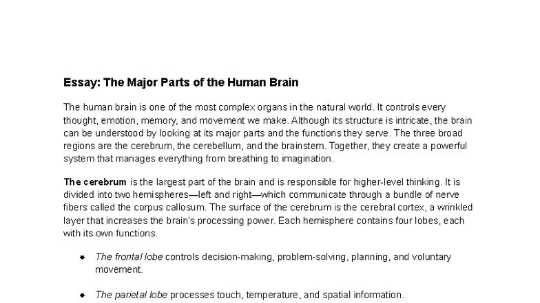 Essay: The Major Parts of the Human Brain (BIO 101) - Studocu