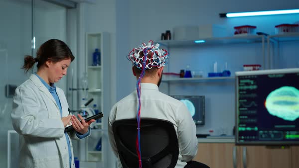 Man Wearing Brainwave Scanning Headset Sits in a Chair while Scientist ...
