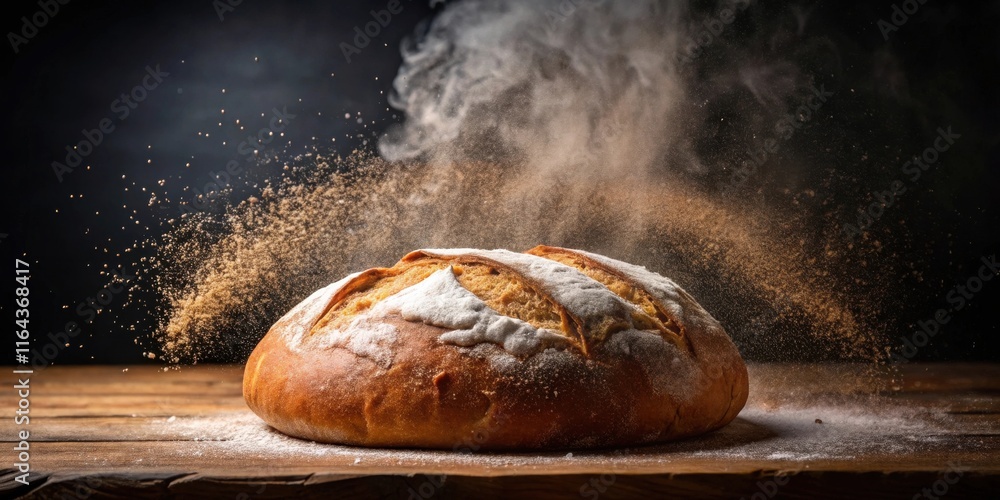 Freshly Baked Loaf of Bread with Flour Explosion 48787654 Stock Photo ...
