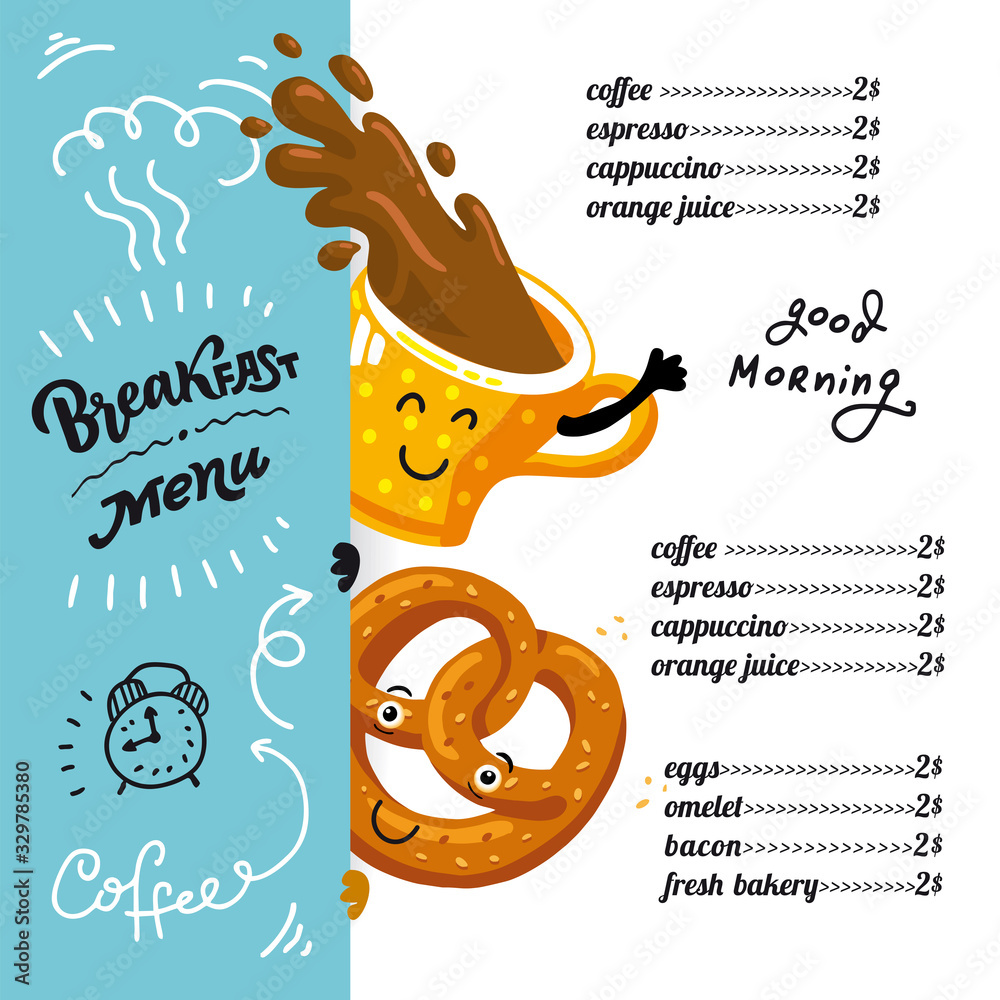 Vector design Breakfast menu with calligraphy lettering. Flat chalk ...
