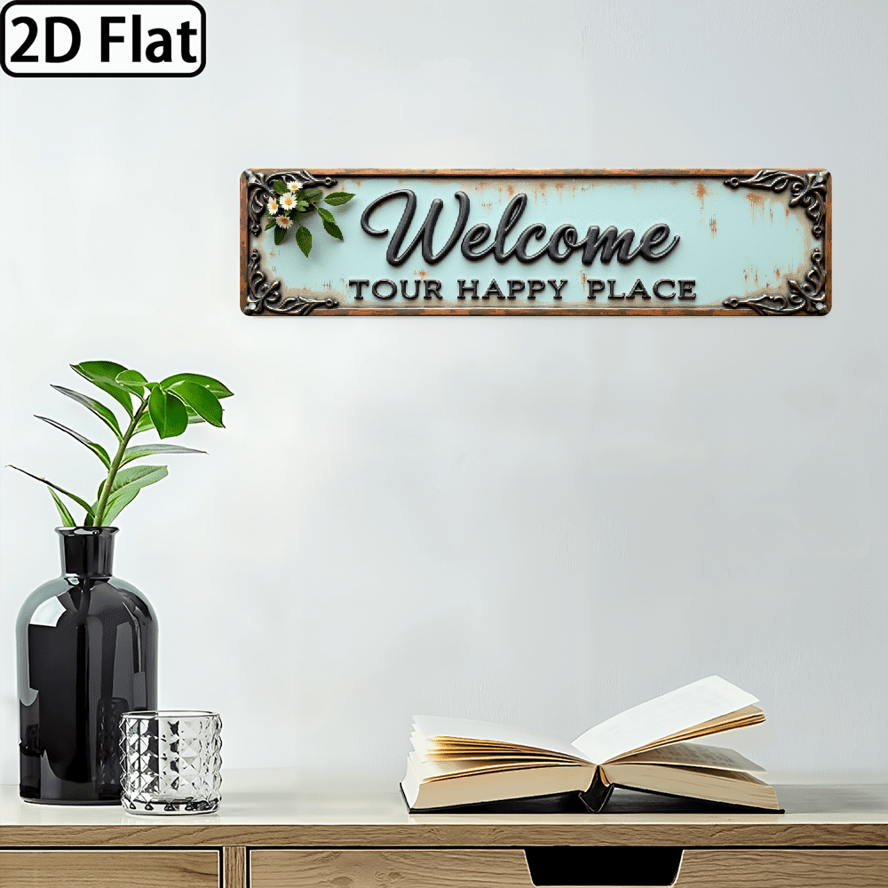 2D Flat, Vintage Floral Welcome to Our Happy Place Metal Sign -4x16inch ...