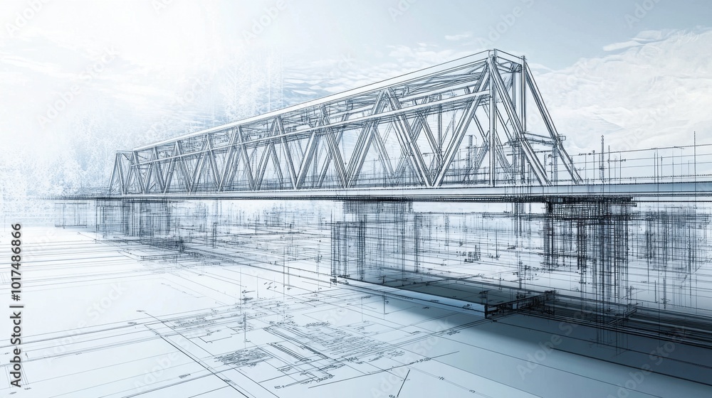 Vision of a bridge in 3D architectural modeling with blueprint details ...