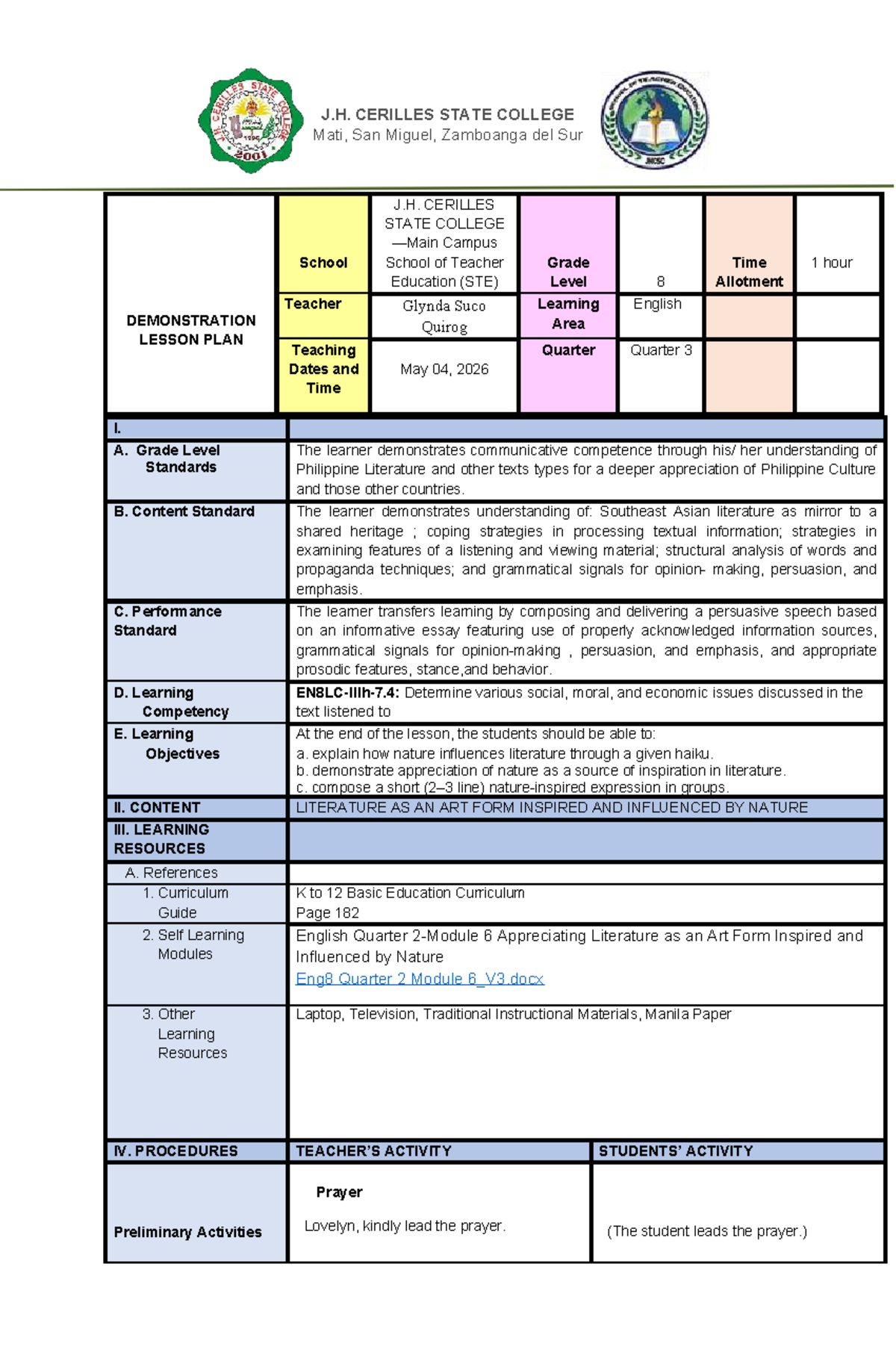 Glynda Suco Quirog - Lesson Plan for Pre-Service English Teaching - Studocu