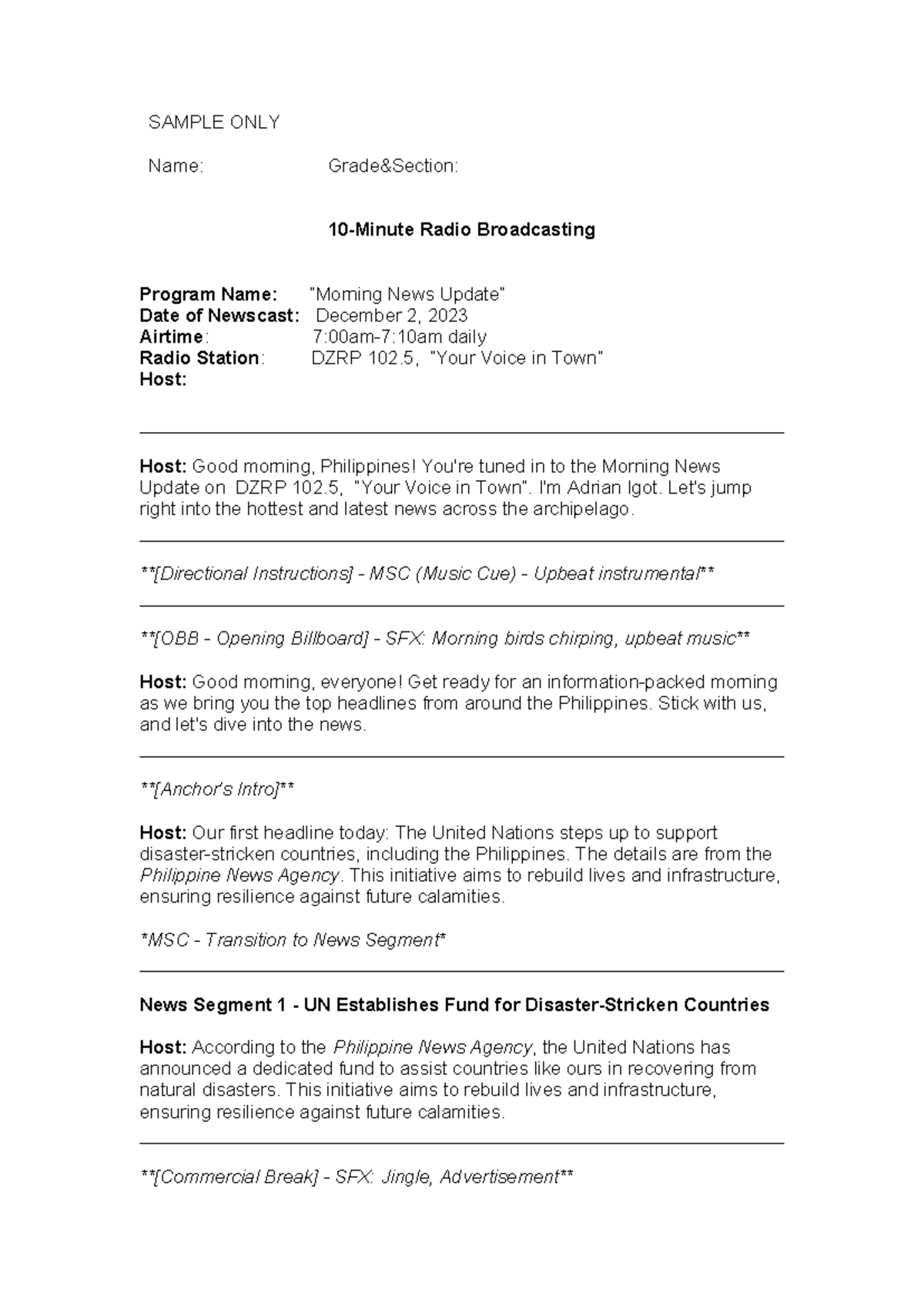 Sample Radio Broadcasting Script - SAMPLE ONLY Name: Grade&Section: 10 ...
