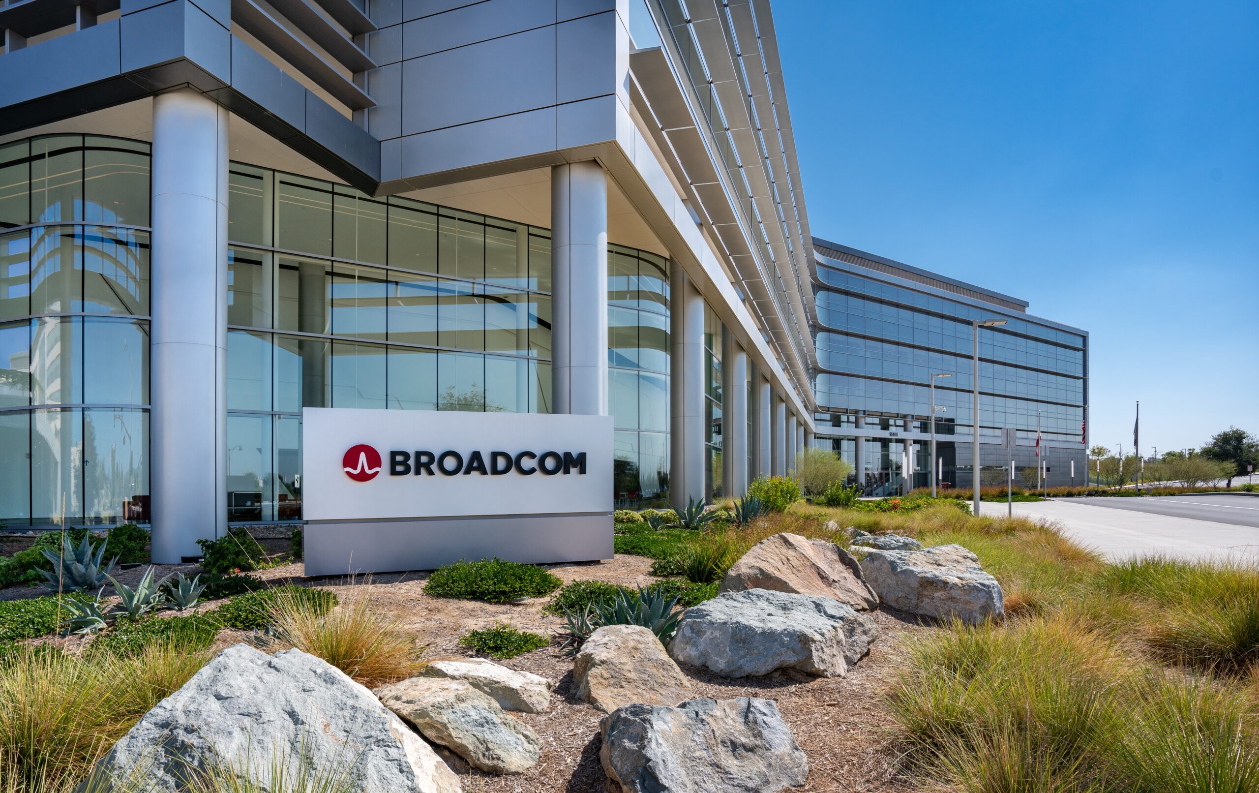 Broadcom sign at company headquarters campus in Silicon Valley, high ...